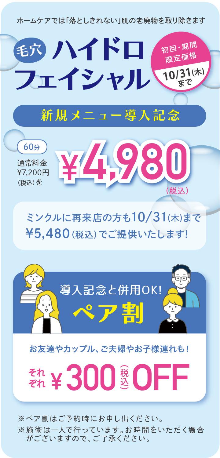 プライベートサロンですので、大手のようなコース設定などはなく、殆どのメニューが都度払いですので、ご安心ください。 また学生の方は¥500割引にさせていただいております(体験コースは除きます)